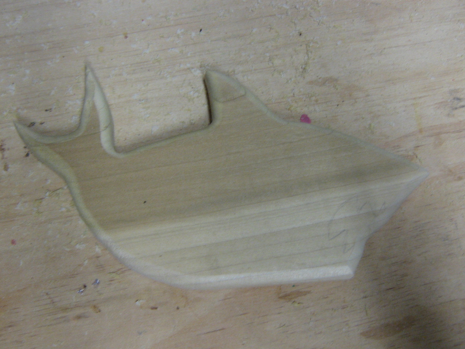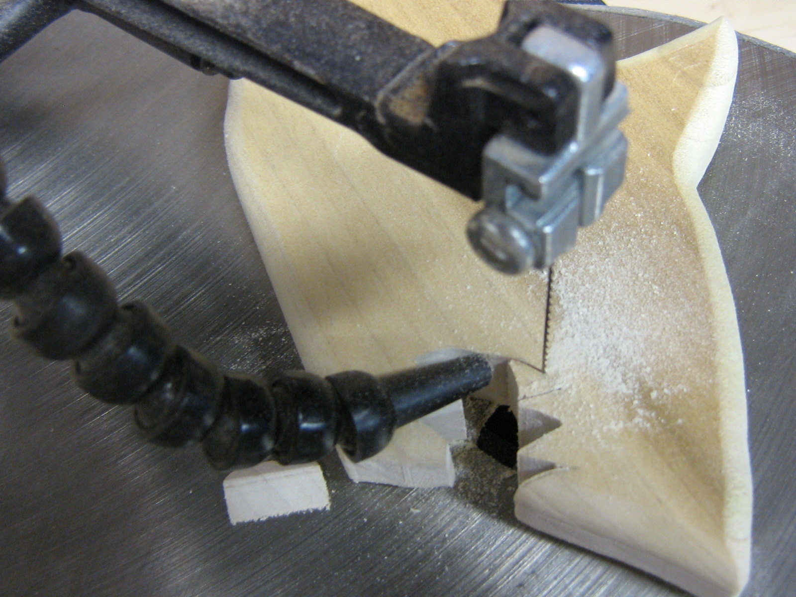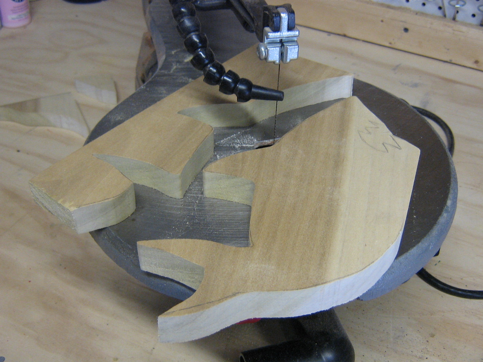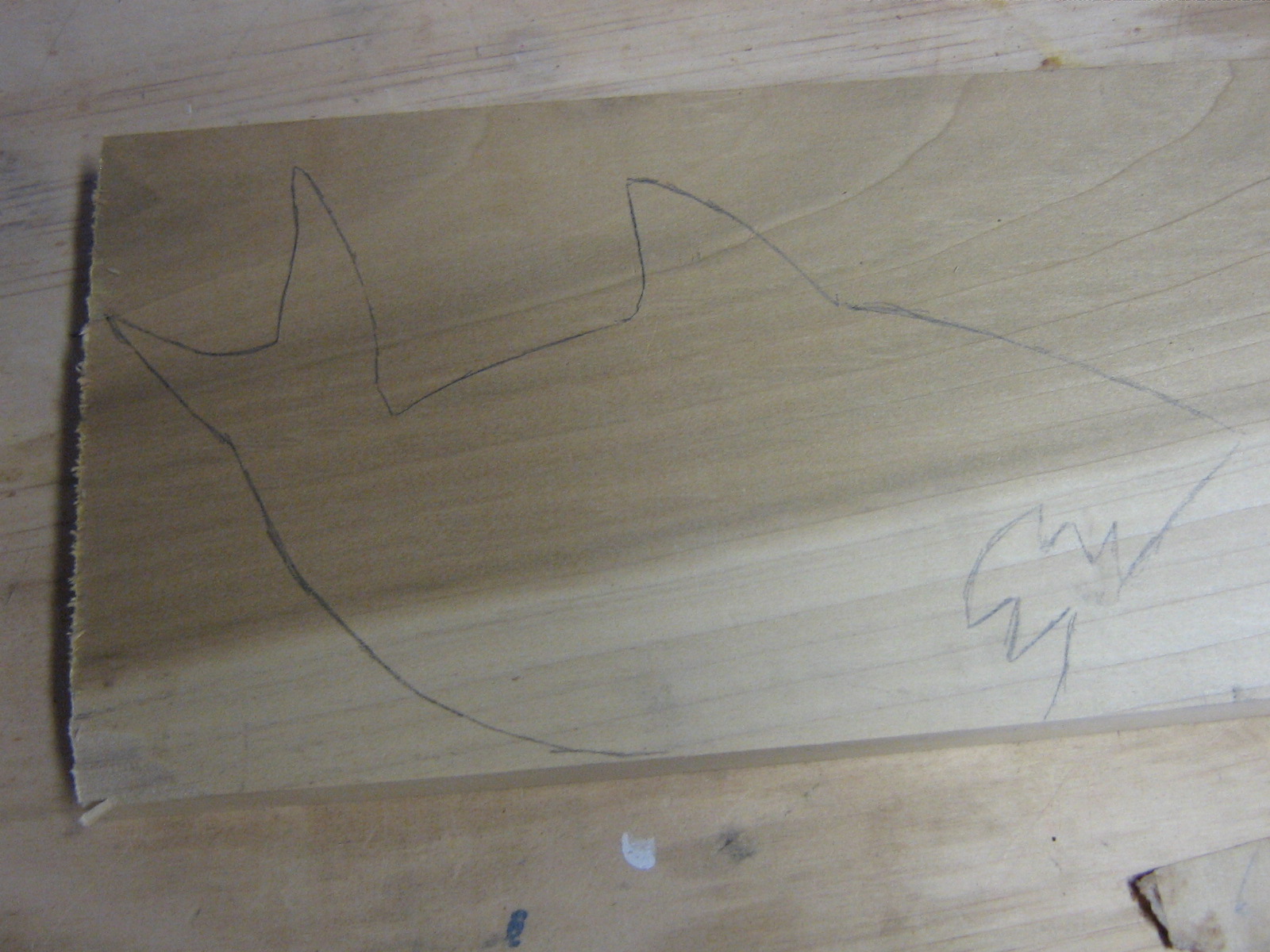 White Shark The template is sketched directly onto the stock. This is a piece of poplar leftover from another project.White Shark Using the scroll saw, I cut away all the wood that is not the shark. Note that I did not cut out the teeth yet. White Shark The next step is to use the router to round off the edges. This is why I didn’t cut out the teeth yet. You see, I started this project before and I cut out the teeth before I rounded the edges. The router bit caught in the teeth and ripped off the bottom jaw and almost injured poor little old me. So I learned to do it the correct way. White Shark Now we go back and do the dental work.White Shark