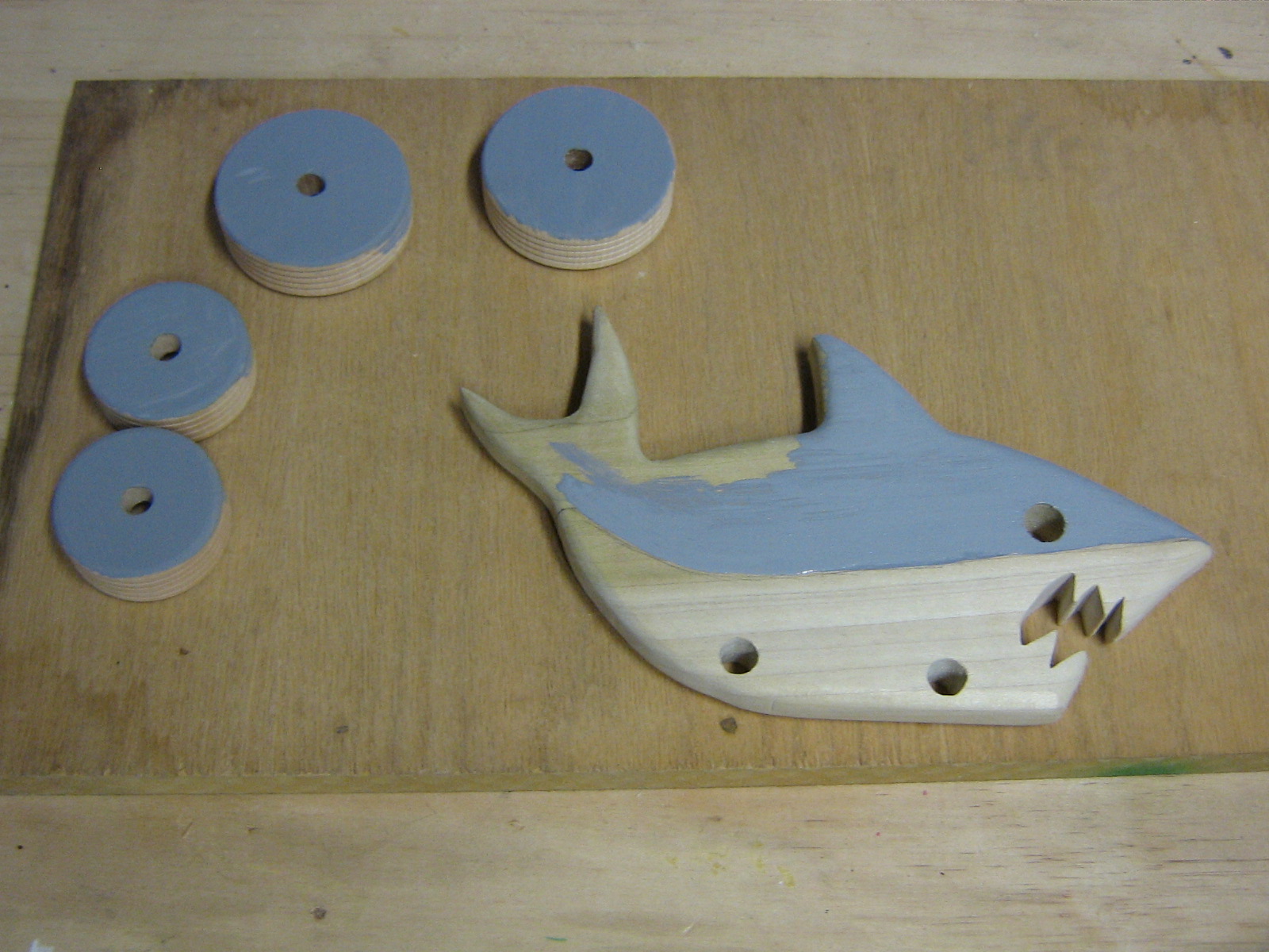 This wood stock had a nice color in the grain where the shark’s colors meet. However, it was only on one side and with the paint you wouldn’t see it anyway. Now, the general rule is to put down your lighter colors first and go over them with the darker ones. I would have done that except that I didn’t have the proper color white. So I ran to the craft store while this coat dried.