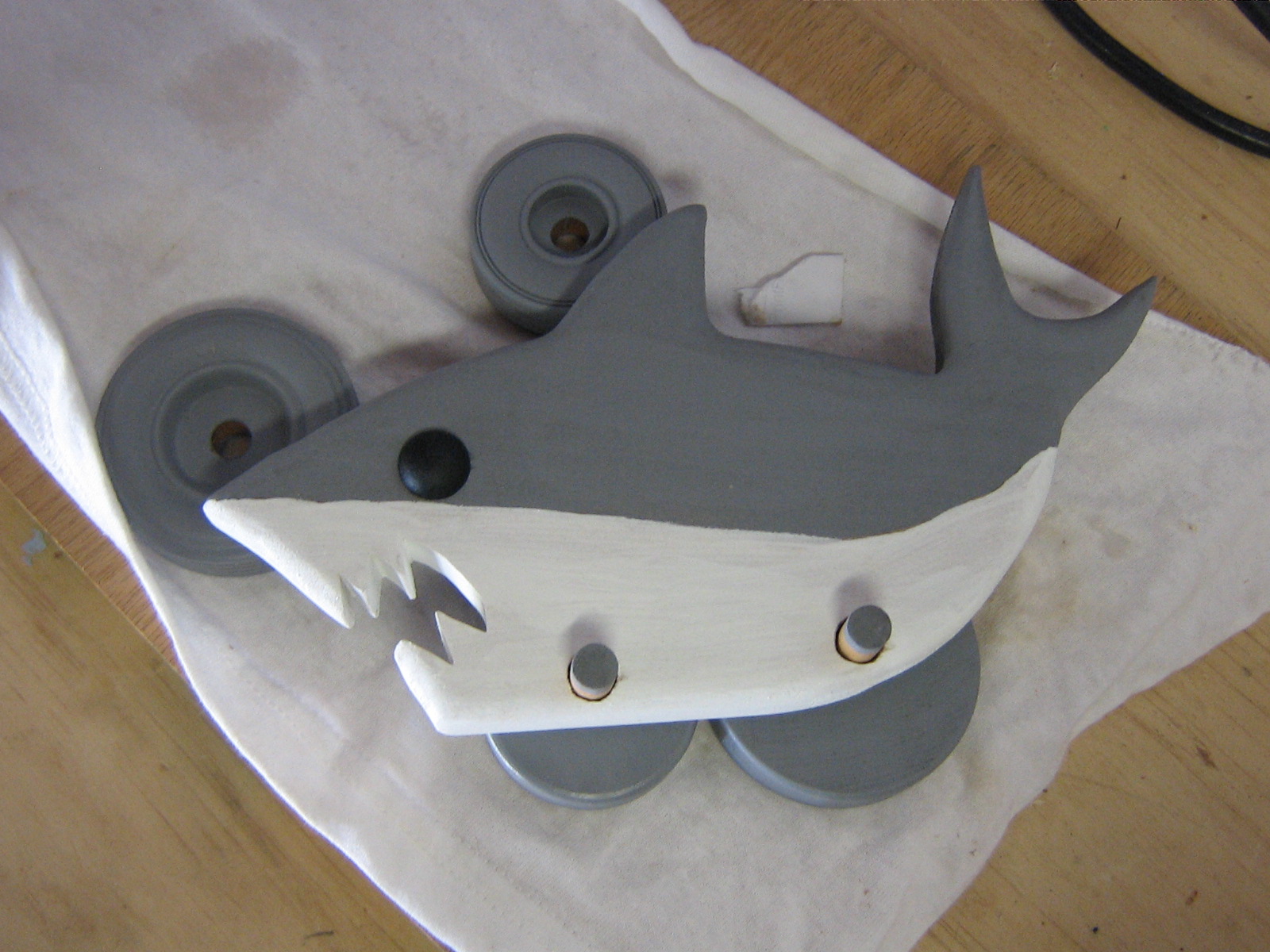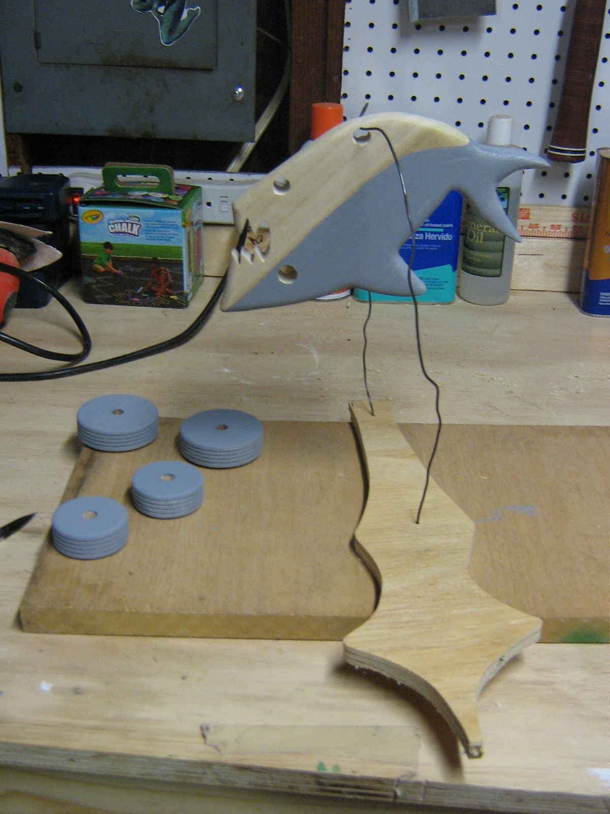 Because I am both impatient and inventive, I didn’t want to wait for one side of the shark to dry before I could paint the other so I contrived a contraption out of some baling wire for to hang the shark while being painted and for drying. This is a good opportunity for me to tell anyone who might be interested in this as a hobby- never throw away any of your scrap wood. You will almost always find a use for even the most oddly shaped scraps. Yes, it’s true that over time you can amass a collection of scraps, but if you’re not working them through and finding new and wonderful purposes for them, you just aren’t working in your shop enough.