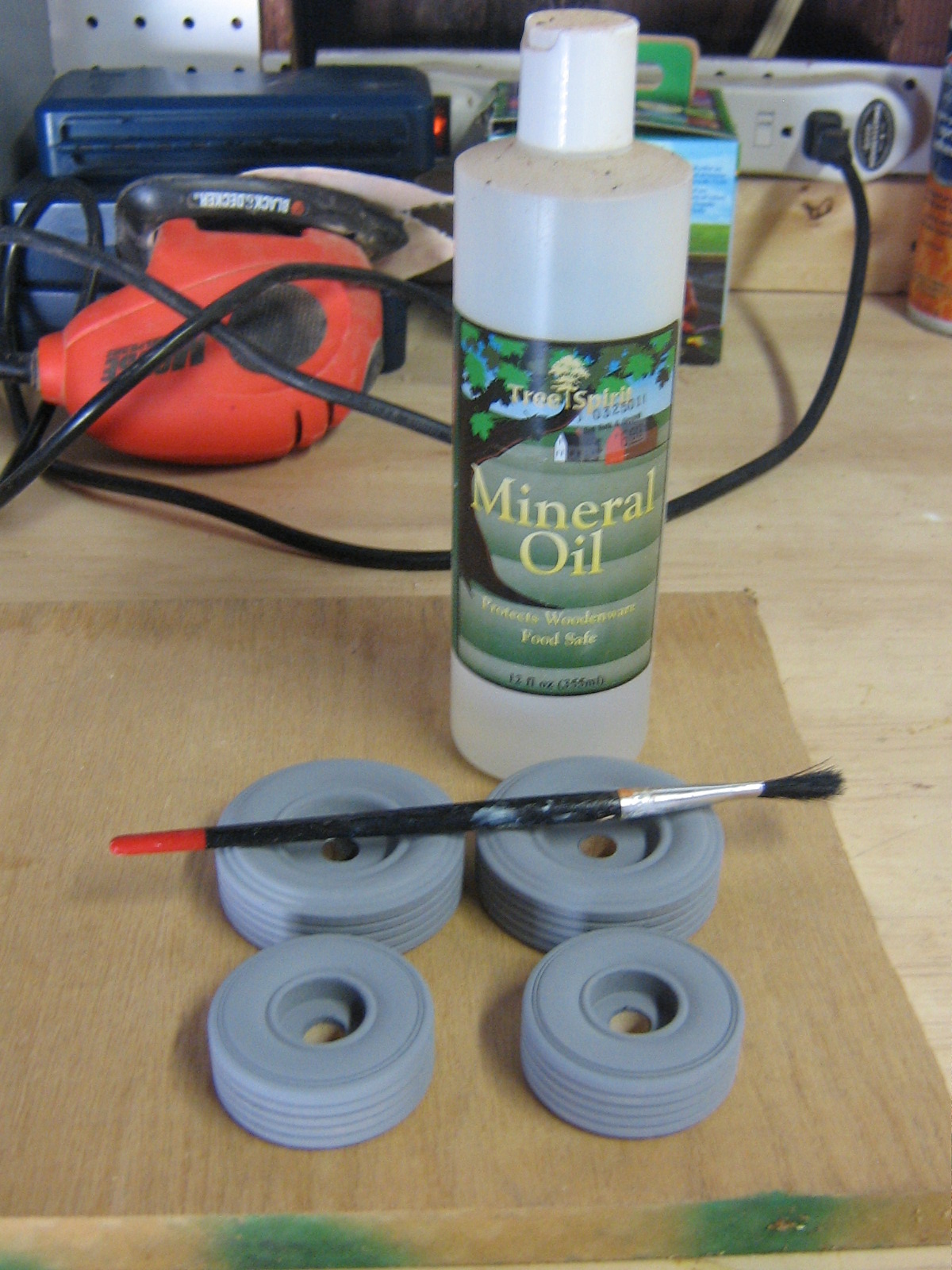 So then, after your paint is all dry you will go ahead and buff with steel wool, then it’s time for the finish. Since this is a toy and we don’t want our children to be ingesting dangerous chemicals other than those approved by the fast food or pharmaceutical companies, I use a food-grade mineral oil for my finish. In fact, this particular oil is found in the kitchen section of Bed Bath and Beyond and is used for preserving cutting boards.