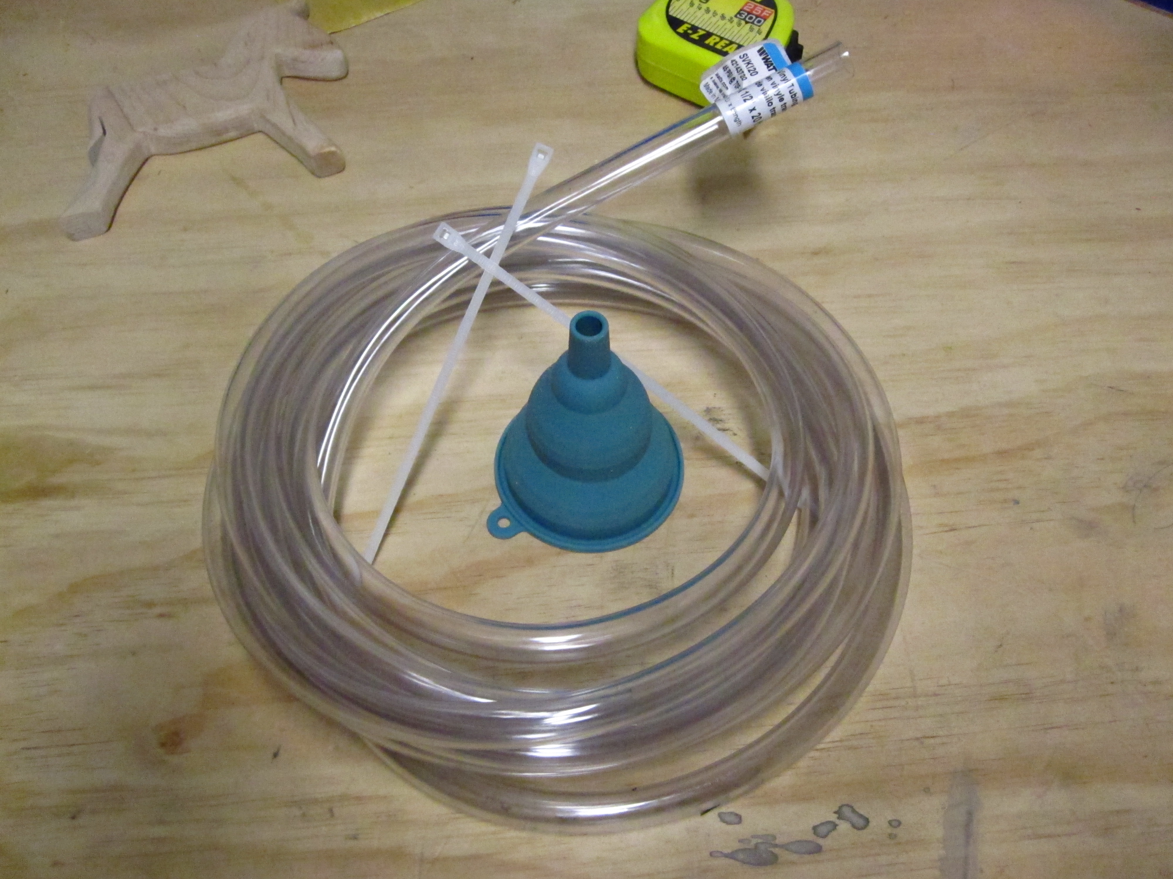 What you will need is a funnel, 2 zip ties, and some vinyl tubing. I already had a kitchen funnel and the tubing can be found at your local hardware store for about $3.00. (Tubing of this kind is very useful for Halloween projects too, by the way.)