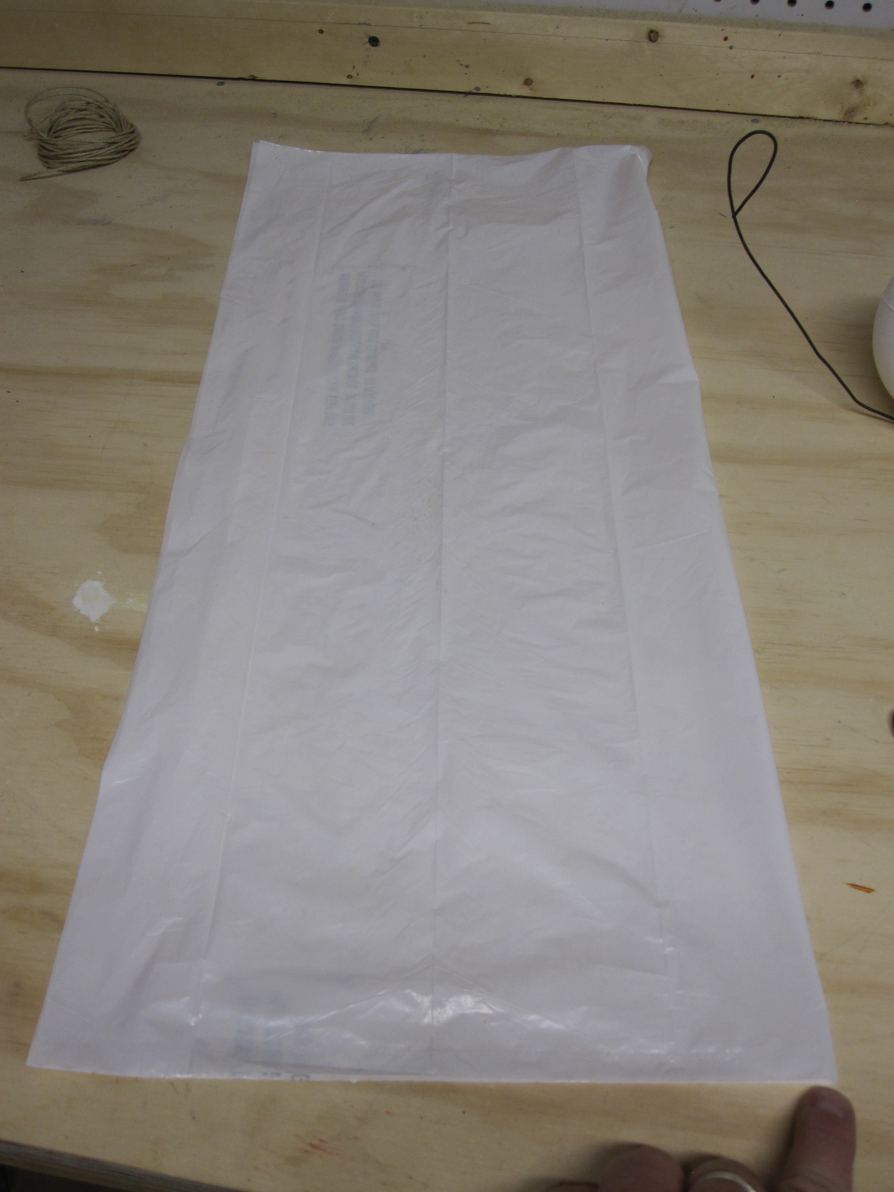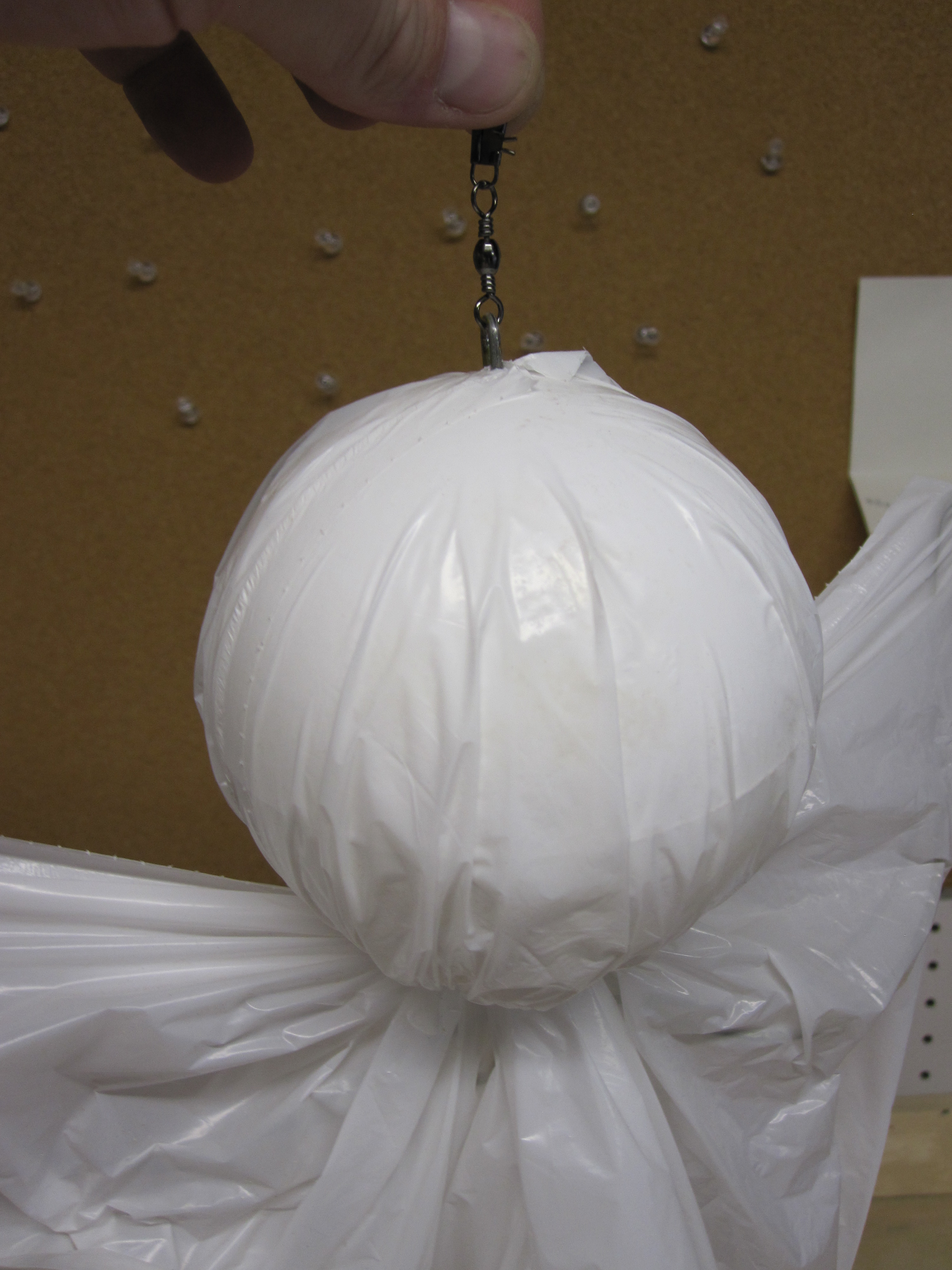 Place the assembly into the bag and run the length of wire at the top of the head through the hole in the bag. Wrap your fingers around the neck of your ghost to tighten the bag over the head and arms. You will move some plastic around to get the perfect fit. Sometimes you can get the bag twisted and the finished product looks less like a ghost and more like a trash bag spinning in the breeze. You don’t want that. Play with it a little bit before moving to the next step to ensure it looks right.