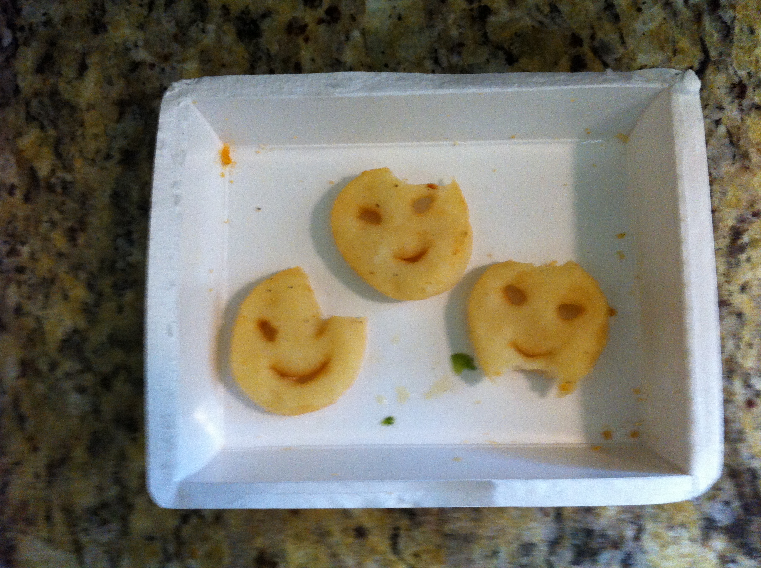 Before I go I must explain the first of tonight’s pictures. Spawn of Scarydad, my sweet little daughter, sometimes eats these little chicken nugget meals that come with smiley-faced french fries. Every time she feasts on one these dinners, she dutifully takes a bite out of the head of each smiley fry, and then chomps the chin of one of the three. She does this every time. What does this mean for the future of humanity? I DON’T KNOW!